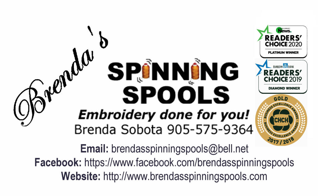 Brenda's Spinning Spools is a home business providing personalized embroidery on items preferably provided by you or, if desired, furnished at cost. The business is located in Hamilton, Ontario and services Hamilton and local municipalities in the Golden Horseshoe area.